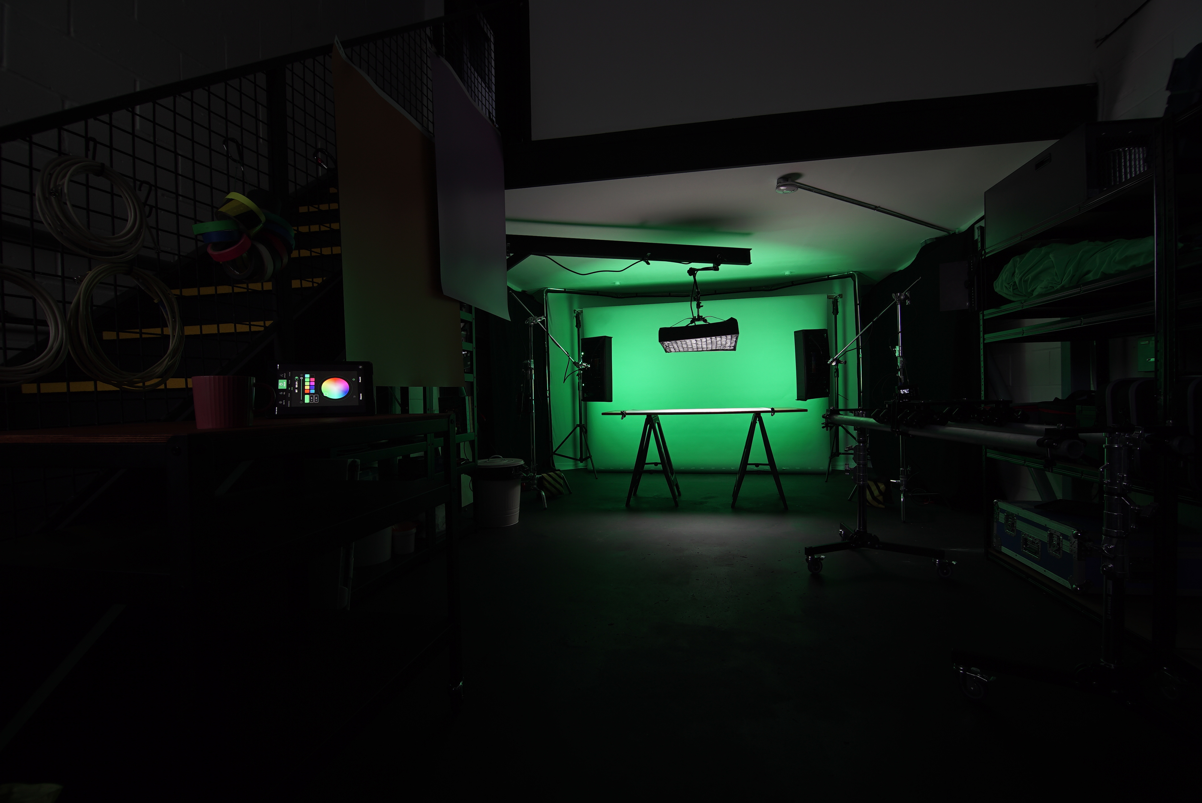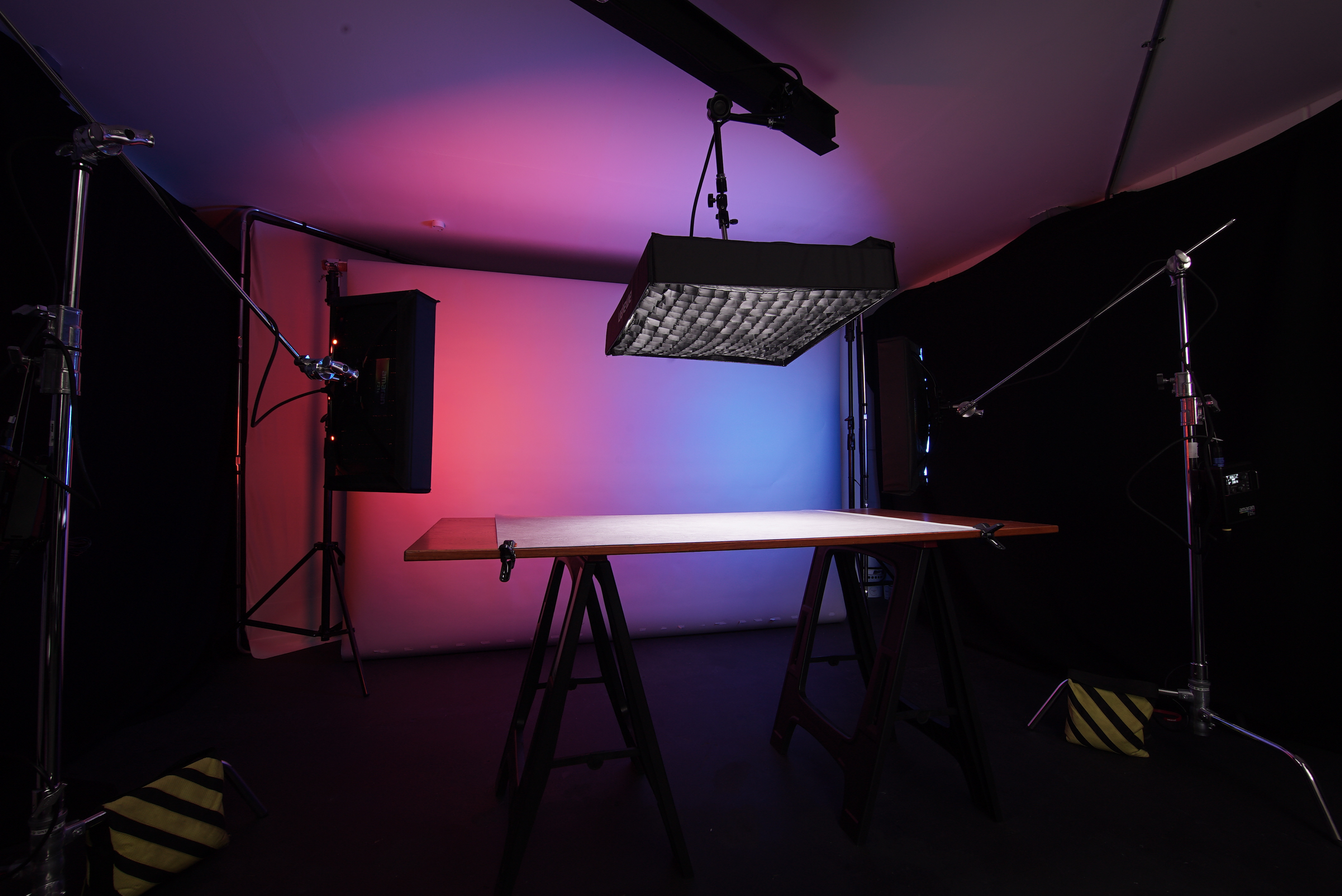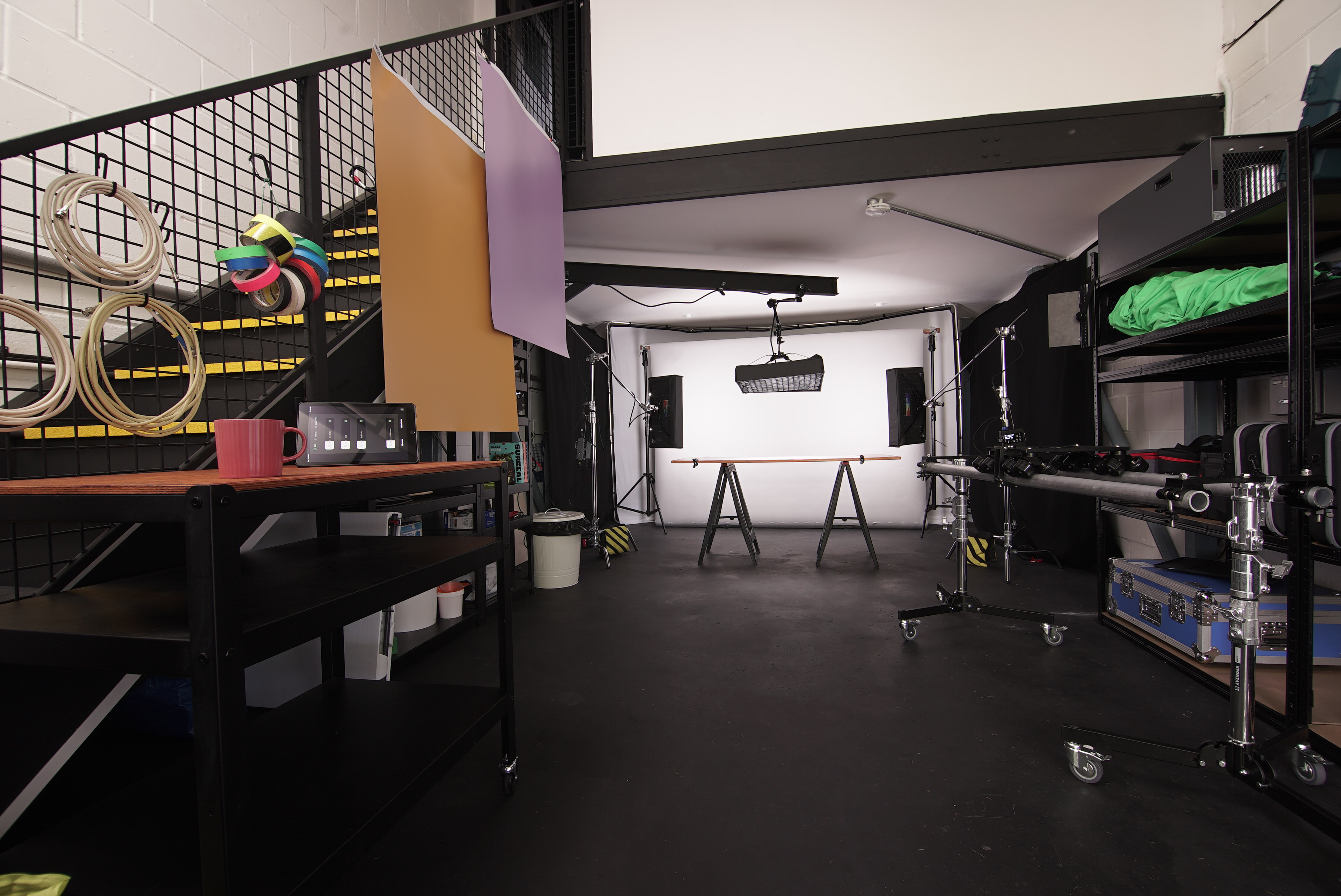 The studio is fitted with a 4m wide, 2.3m high backdrop, in either white, black or chroma-key green.