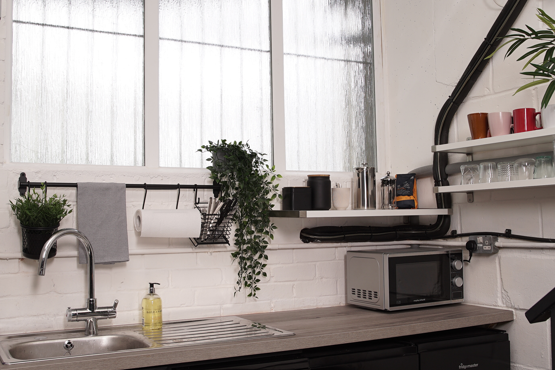 Unlimited tea, coffee and filtered water is all included and the studio's kitchenette has a fridge, freezer, dishwasher and microwave available for your use.